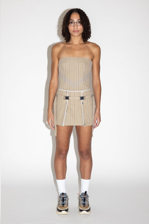 100% brushed canvas quilted mini skirt. Contrast quilting, striped poplin binding finishings, back welt pocket and flap pocket. Adjustable straps and buckles with j/w snap front vent closure.